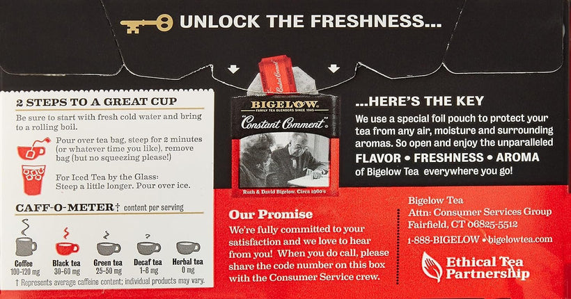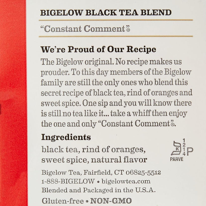 The Bigelow original. No recipe makes us prouder. To this day members of the Bigelow family are still the only ones who blend this secret recipe of black tea, rind of oranges and sweet spice. One sip and you will know there is still no tea like it… take a whiff then enjoy the one and only “Constant Comment”. We use a special foil pouch to protect your tea from any air, moisture and surrounding aromas. So open and enjoy the unparalleled flavor, freshness, and aroma of Bigelow Tea everywhere you go! Ingredients: black tea, rind of oranges, sweet spice, natural flavor.