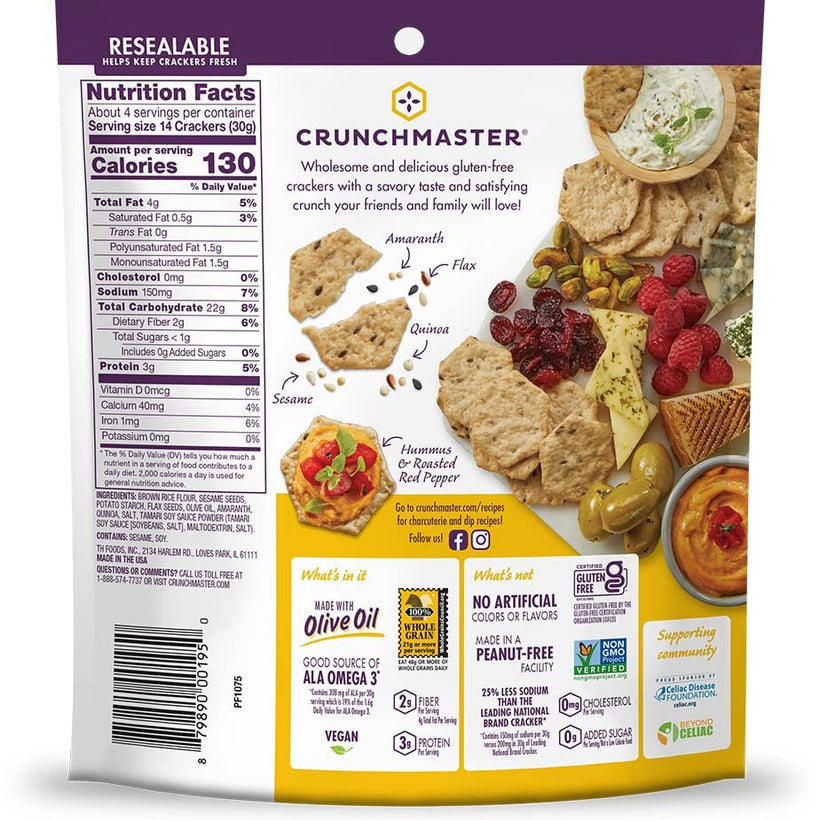 - Original: Made with sesame, quinoa, flax and amaranth, these low fat baked crackers contain 18 grams of whole grain per serving; A delicious crunch with a touch of wheat free tamari soy sauce for a light, savory taste
