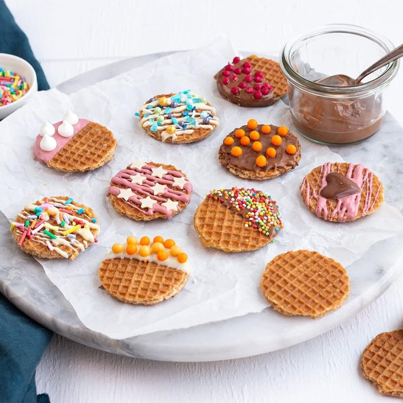 Daelmans mini Stroopwafels are great for sharing and also a lot of fun to decorate. Get creative and make your own piece of edible art with sprinkles, tiny candies and chocolate.