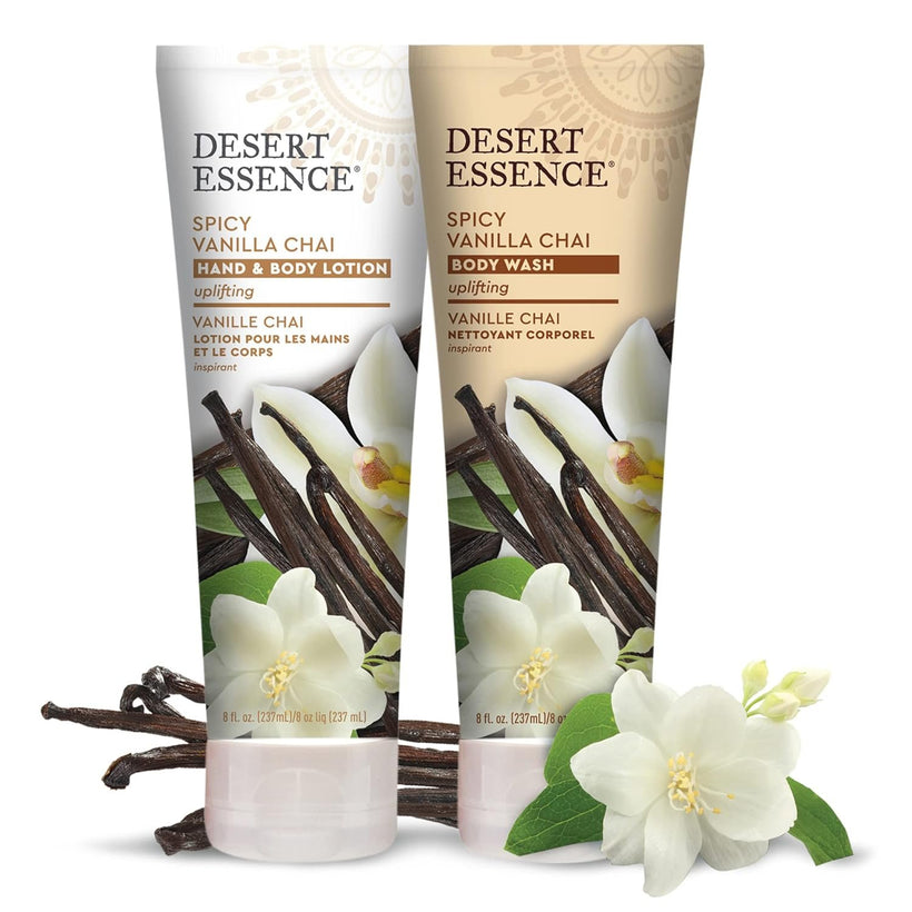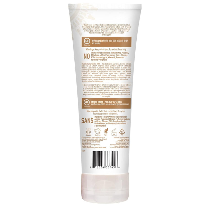 Desert Essence Spicy Vanilla Chai Hand and Body Lotion offer protection against skin damage from environmental stressors. It contains anti-oxidant rich organic black tea and org...