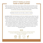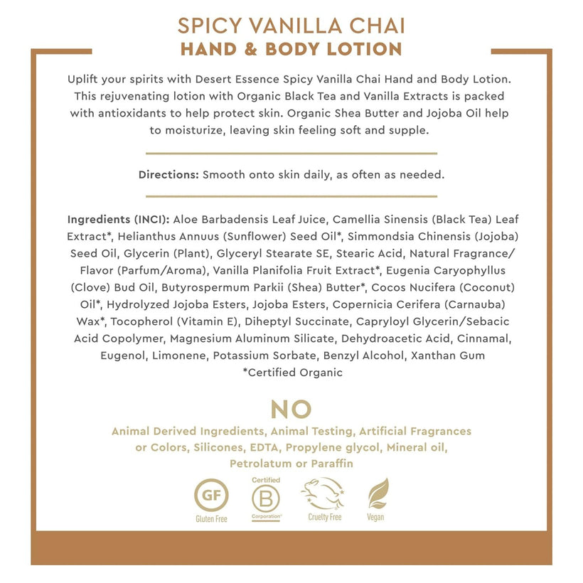 • NSF ORGANIC STANDARD - Desert Essence spicy vanilla chai hand and body lotion uses natural ingredients and is certified to NSF organic standards.