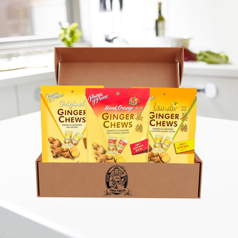 Ginger Chews Candy Variety Pack for Upset Stomach or Nausea Relief, Indivudally Wrapped Original, Lemon and Blood Orange Flavored Chewy Candies, Non GMO Sharable Snacks for Road Trips, Pack of 3