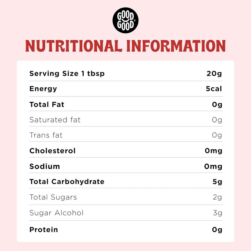 • WHY CHOOSE GOOD GOOD - Good Good is a brand offering a range of healthy, sugar-free products across the USA. In order to create the sweet taste we use the highest quality natural sweeteners available, containing zero or very little calories.