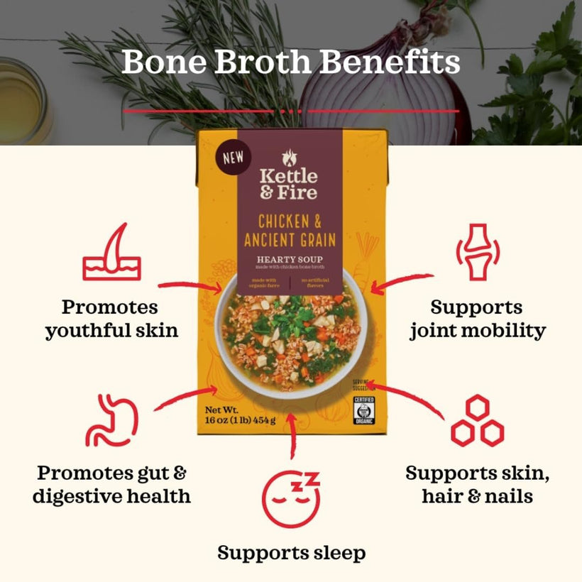 - BONE BROTH BENEFITS: Use our bone broth soup to support youthful skin, promote a healthy gut, boost the immune system and improve joint health. Nutritionists prescribe daily bone broth soup as part of weight loss regimen or as a simple way to ensure your body gets the nutrients it needs to thrive.