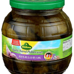 Enjoy Gundelsheim Garlic Barrel Pickles 35.9 Oz. You can serve them for Sunday brunch, for dinner or as part of a party buffet. (Please note information is descriptional only. Please refer ingredients on product prior to use and please consult your health professional with any health or dietary matters before use.)