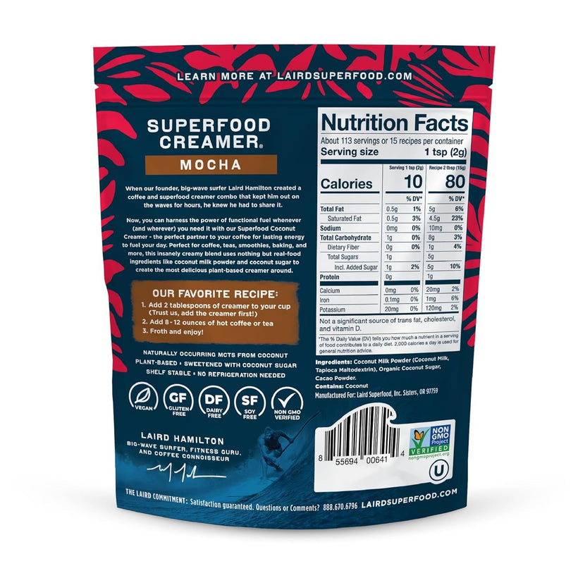 • Laird Superfood Non-Dairy Coffee Creamer Mocha, Shelf-Stable Superfood Non-Dairy Powder Creamer, Gluten Free, Non-GMO, Vegan, 8 oz. Bag, Pack of 1