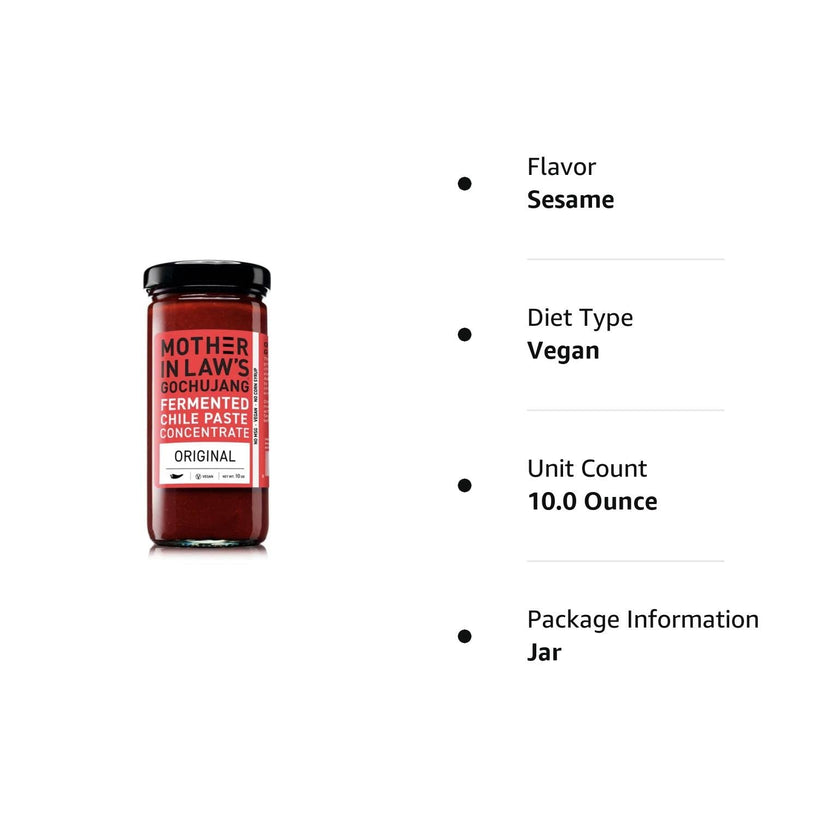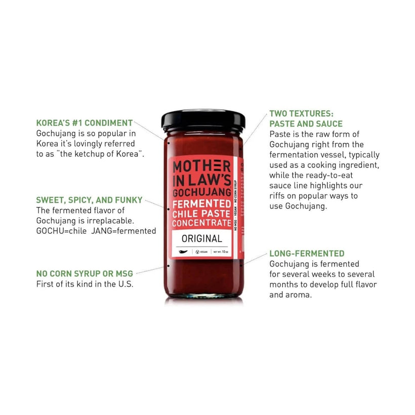 Mother-in-law's Kimchi [MILKimchi] grew out of a labor of love to share a delicious, artisanal kimchi. As an avid food and wine lover, founder, Lauryn Chun, was inspired to recreate the same kimchi from her mother's beloved restaurant in California. The original, "House Style" MILKimchi recipe hails from the 22 year-old restaurant, Jang Mo Gip [translates into mother-in-law's house], founded in 1989 by Lauryn's mom, in Garden Grove, California. Natural fermentation makes it a healthy probiotic food that is good for your digestion. Gochujang is the most popular pantry staple in Korea. Use it as you would tomato paste in cooking, dips, sauces or sandwich spread for spicy umami flavors. Available in 4 flavors: Gochujang fermented Chile Paste Concentrated (Original): Signature Gochu (Chile) Jang (fermented paste) made by using time honored traditional methods with no high fructose sweeteners or msg. Gochujang fermented Chile+ Tangy 01: Tangy flavor combination of vinegar (cho) and fermented Chile paste (gochujang) is aka Cho-gochujang. Tangy sesame flavors make this a perfect sauce with shrimp cocktails, calamari, French fries and hot dogs. Gochujang fermented Chile+ Sesame 02: Rich, nutty sauce takes center stage with the combination of sesame seeds, peanuts and fermented Chile paste. Gochujang fermented Chile + Garlic 03: This classic sauce of garlic, ginger and fermented Chile paste is complex with a layered, lingering spice. Delicious on everything. These products contain gluten. Manufactured in a facility that processes milk, seafood, soy, nuts. Mother In Law Kimchi Gochujang fermented Chile Paste, Concentrated, 10 Oz.