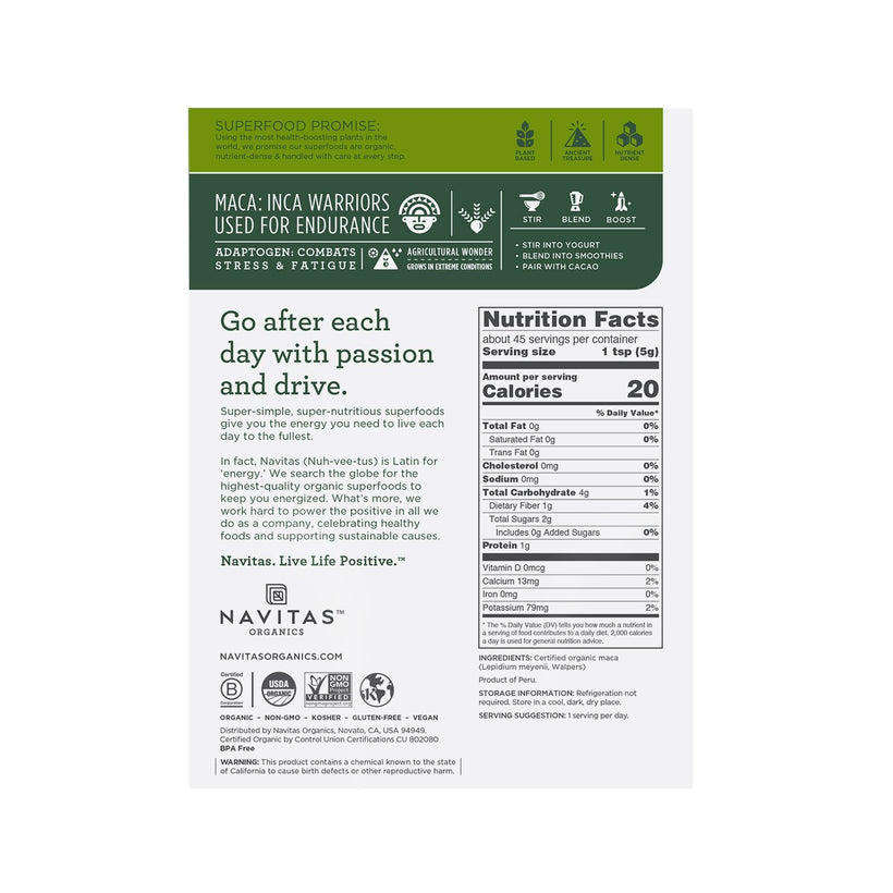 • Navitas Organics Maca Powder energizes naturally, without the jitters and crashes of caffeine.