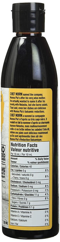 Nona Pia's Classic Balsamic Glaze Chef Norm names the company Nona Pia's after his very wise mother. He actually wanted to name it after his lovely wife Natasha, but she burns salads. That said, even her dishes are delicious with Nona Pia's Balsamic Reduction added. Packaging May Vary. Set of 6.