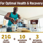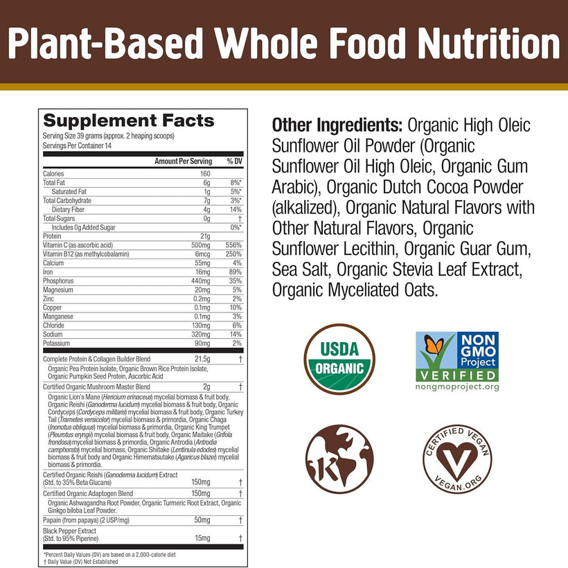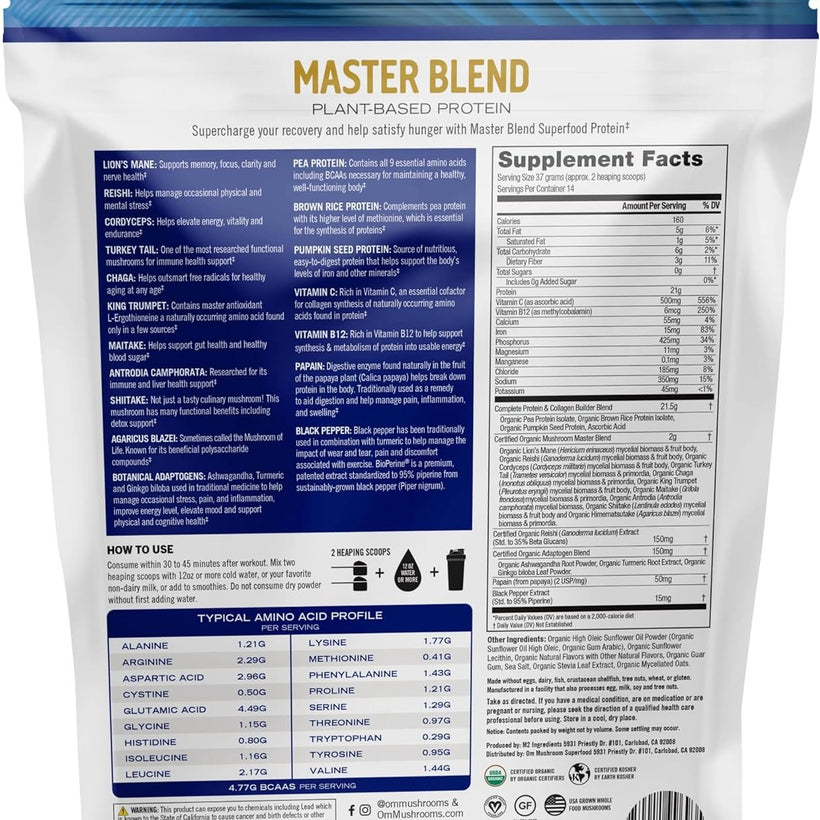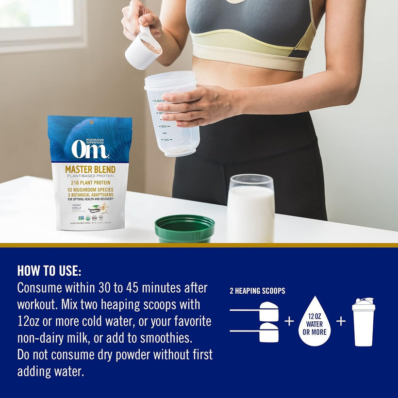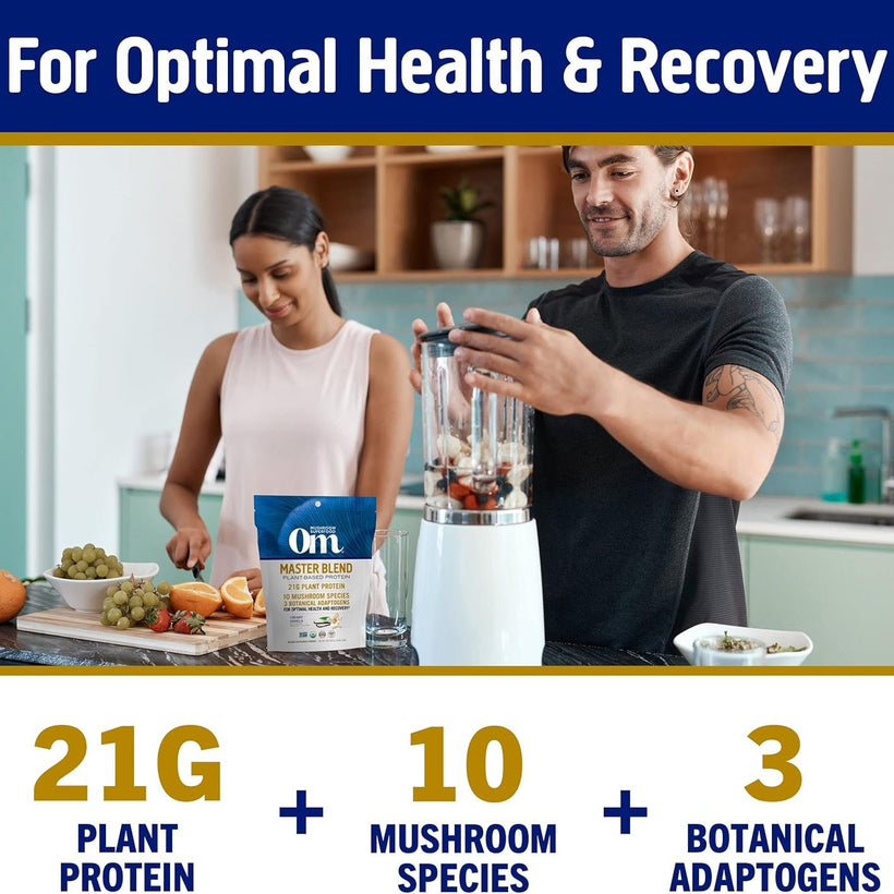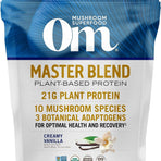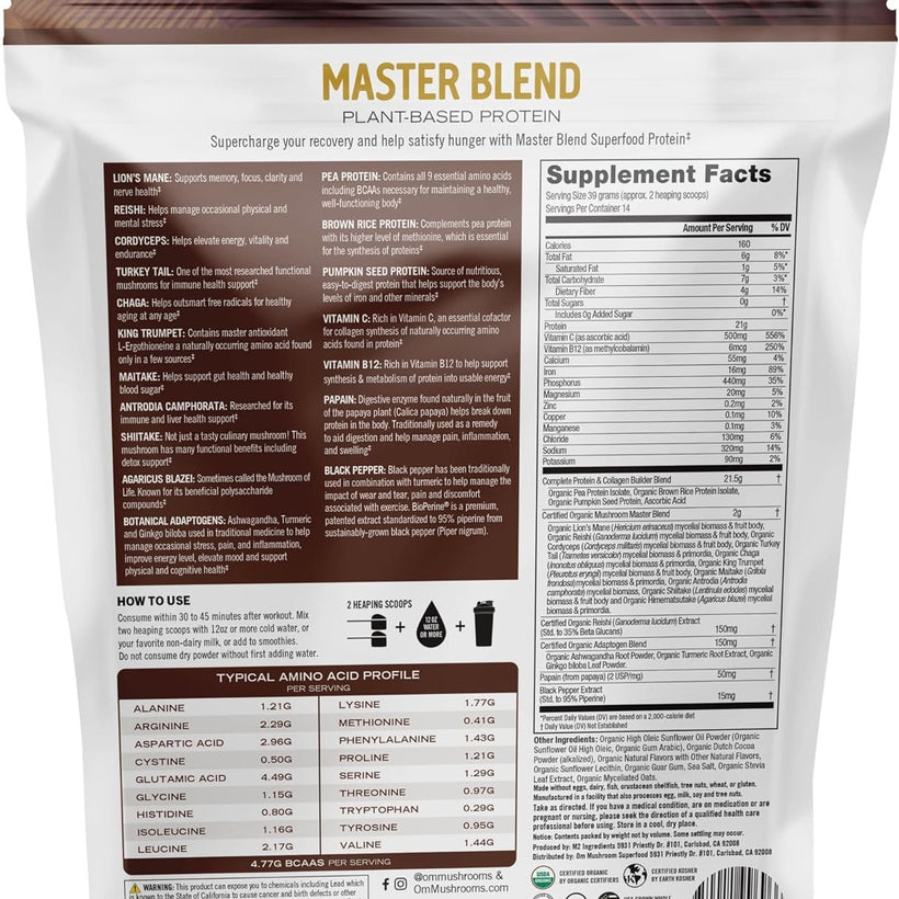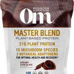 - Om Mushroom Superfood Master Blend Plant-Based Protein Powder: Contains one 19.26 ounce pouch (14 servings) of Creamy Chocolate Protein Powder with 10 Mushroom Species including Cordyceps, Reishi, Lions Mane, Turkey Tail, Chaga, and more for optimal health and recovery. Each serving of this organic mushroom complex provides 21 grams of plant-based protein and 2,000mg of mushrooms
