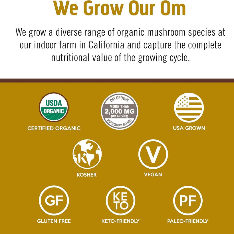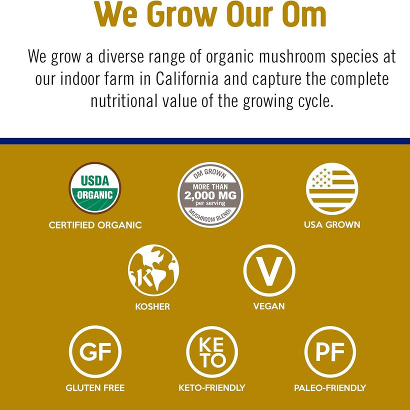 - USA Grown the Om Way: Om Mushroom Superfood Powders, Capsules, Hot Drinks, Energy Drinks and Broths are all produced in the USA. We grow, dry and mill our organic mushrooms into powders in our state of the art facilities in Southern California, to ensure the highest quality, and verify using 3rd-Party Testing. Om Mushroom powders are USDA Certified 100% organic, non-GMO, gluten-free, vegan, grown in the USA, paleo-friendly, keto-friendly, kosher