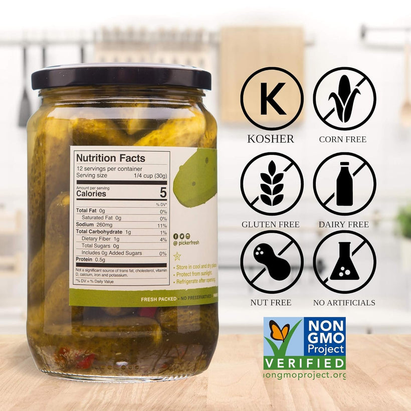 - KOSHER DILL WHOLES: Pickerfresh Pickles are made with extraordinarily fresh cucumbers and the ideal blend of spices. Enjoy straight out of the jar to experience the Pickerfresh Fresh Food, Fresh Mood difference.