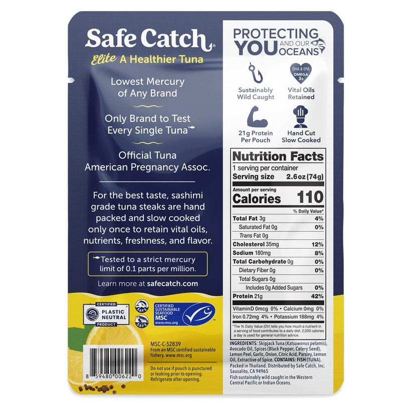 - LOWEST MERCURY SEASONED TUNA – Safe Catch Elite Citrus Pepper Wild Tuna is our purest, lowest mercury tuna, lower on average than any other in the market. Full flavored with citrus and black pepper. Average mercury 25X lower than the regulated action limit.