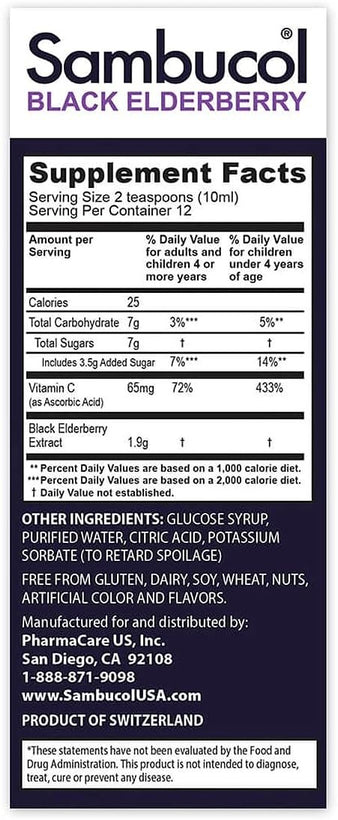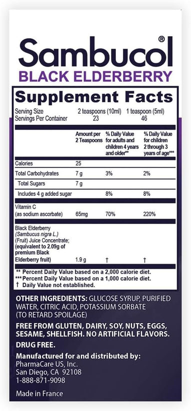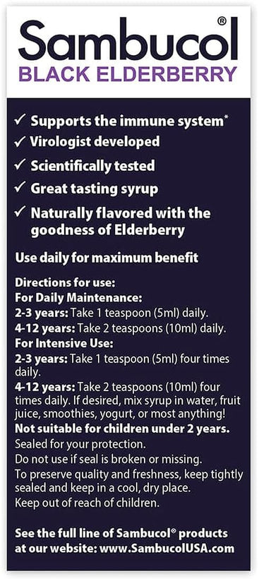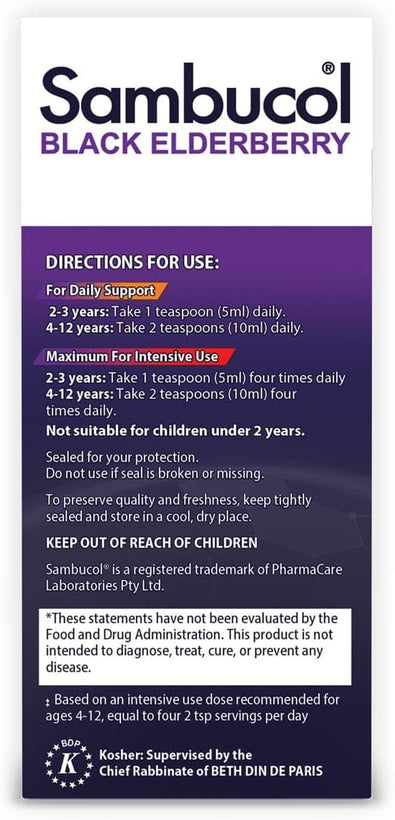 Sambucol Black Elderberry Kids Syrup, 7.8 Fluid Ounce -- 1 each. Sambucol for Kids, now in a larger size bottle Black Elderberry has been used to improve health for over 4000 years, and has been called natures medicine chest. Sambucol was developed by a world renowned scientist who recognized the potential of the antioxidants present in the Black Elderberry. Sambucol Black Elderberry utilizes a unique preparation method that preserves and maximizes the naturally occurring health benefits of the berry. Sambucol for Kids is specially developed for use by Kids ages 2-10, and is a great tasting way to make sure they are getting the immune support they need Kosher, Gluten Free, Wheat Free.