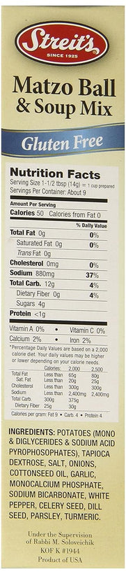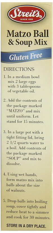 Streit's gluten free matzo ball and soup mix is perfect for all of your Passover cooking uses, and makes great matzo balls. Has a convenient pull-out spout for easy pouring. Easy to prepare and great taste. Ingredients include certified gluten free flour and water only.