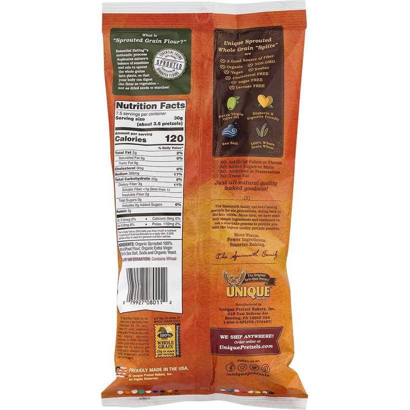 Sprouted "Splits" are the tasty wonder made with nutrient rich wheat flour that your body treats like a vegetable and digests easily. Our artisan process bakes in a hearty all-natural flavor along with the crispy bubbles & crunchy crevices that make "Splits" Unique. Unique Pretzels Sprouted "Splits" Pretzels are made from 100% whole grain sprouted wheat flour. They are slow-baked to create deep grooves and crevices that are crunchy and full of flavor. Sprouted "Splits" Pretzels are USDA organic certified.