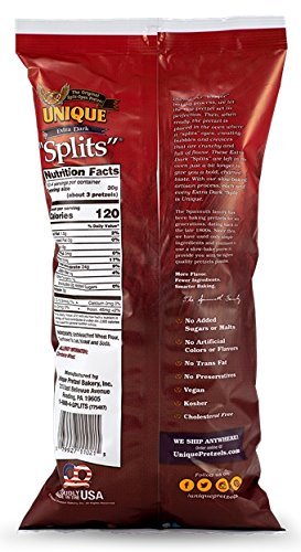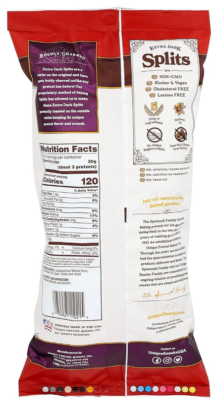 Extra Dark "Splits" are "Uniquely" well-done to coax out a bold charred flavor without over-baking the pretzel on the inside. They are made with high quality, simple ingredients. Our "Unique" slow-baked, artisan process precisely matures the pretzel dough and then bakes it to split-open perfection, creating an all-natural marvel of crispy bubbles and crunchy crevices that are a pretzel lover's delight. Vegan, Kosher and cholesterol free. No: added sugars, artificial colors, flavors, malts, trans fat, preservatives or additives. Just all-natural goodness!