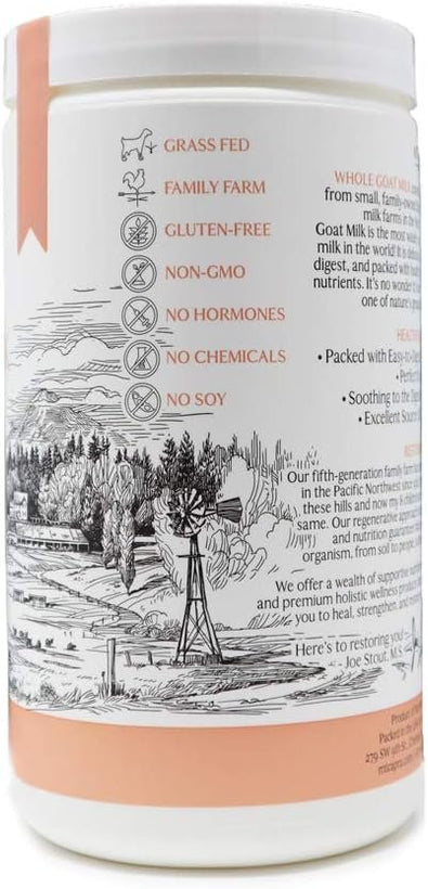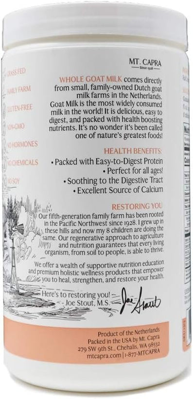 Mt. Capra's Whole Milk is a deliciously creamy goat milk powder that is easy to digest and is a low-allergy potential food. Goat's milk is a great alternative for people with cow milk and soy milk sensitivities to consume and absorb WITHOUT embarrassing and uncomfortable side effects. Goat's milk is naturally homogenized and is higher in essential fatty acids, medium chain triglycerides, vitamin B6, vitamin A, niacin, and potassium than cow's milk.