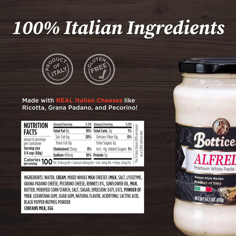 • BOTTICELLI ALFREDO PREMIUM PASTA SAUCE. Authentic white Roman-style alfredo sauce that pays homage to the sauce’s genesis at the Restaurant Alfredo in Rome. Always specially made in small batches.
