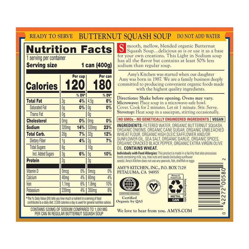 Responding to customer requests, our chefs have created a line of light in sodium soups with all the flavor and goodness of our regular soups, but containing 50% less sodium. Contains 290 mg of sodium compared to 580 mg in Amy's regular butternut squash soup. USDA organic. Certified organic by QAI. Ready serve. Smooth, mellow blended organic butternut squash; delicious as is or use as a base for your own creations. We’re in the business of cooking delicious, organic vegetarian meals for everyone. We were organic before it was a national certification. So when the U.S. Department of Agriculture decided to create standards for organic, they looked to us for guidance. Together with other industry leaders, we helped pioneer the organic food industry and, more importantly, we helped make organic food available to more people. All of our dishes are non-GMO and we’re a proud supporter of GMO labeling initiatives. Because we believe that people have a right to know what they put in their bodies. We were also the first to market with non-BPA-lined cans, and we’re happy to see many other food companies following our lead.