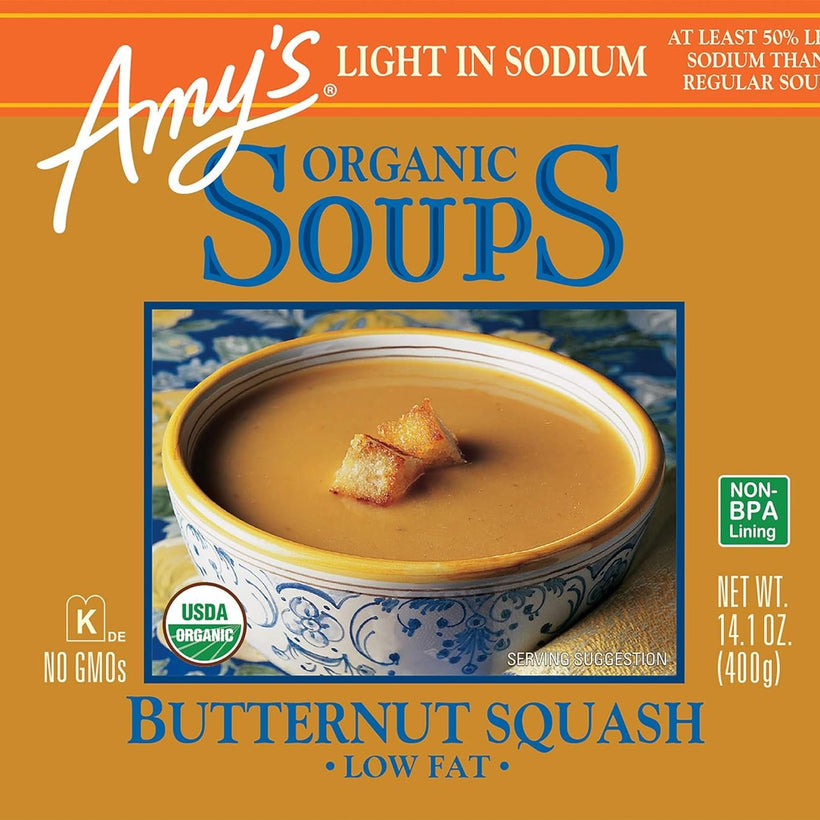 • Twelve 14.1-oz cans of Amy’s Organic Butternut Squash Soup, Light in Sodium with at least 50 percent less sodium than Amy's regular soup