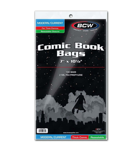 The BCW resealable current age comic bags are an acid free, Archival quality product made of crystal clear polypropylene. These bags have a reusable adhesive tape strip on the body of the bag so the collector can fold the top flap over and lock in the comic. 100 sleeve) per Pack