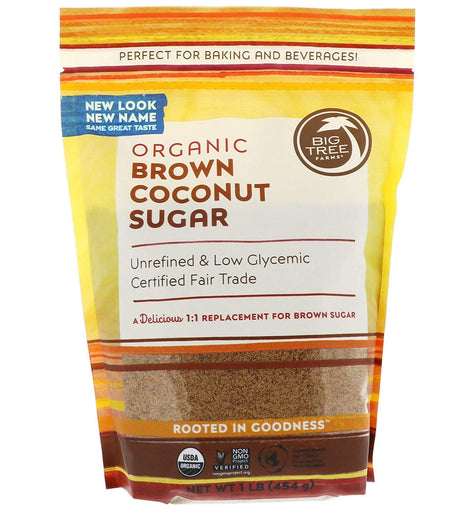 Big Tree Farms Organic Brown Coconut Palm Sugar, 2 Pounds (Pack of 2). BROWN COCONUT SUGAR: A natural sweetener made only from the coconut blossom nectar of the coconut tree. Round and rich with hints of caramel, the warm molasses note in this silky unrefined sugar easily replaces cane sugar. THE BENEFITS: An organic, unrefined, unprocessed alternative to cane sugar or raw sugar. Our coconut sugar is rich in essential minerals and aminos acids and can be a 1:1 substitute for refined cane sugar USDA ORGANIC: Non-GMO Project Verified, Gluten Free, Vegan, Kosher, Low GI, Keto, Fair Trade and Unrefined. Perfect for baking, cooking, beverages and more! GLYCEMIC INDEX: Our Coconut Sugar has a glycemic index rating of "Low" versus cane sugar which is rated "High" which makes it a better alternative for special diets. SUSTAINABILITY: Coconut Trees produce 50-75% more sugar per acre than cane sugar. Coconut Blossom regenerates every 14 days and a coconut tree can produce nectar for 40 years so they are never cut down after each harvest. ORGANIC FARMERS: We work with over 10,000 organic farmer-producers throughout Indonesia, who harvest the nectar twice a day, all year long VERTICALLY INTEGRATED: We own the process from Tree to Shelf which enables us to protect the integrity of our products and allows us to work with farmers to implement practices to mitigate our impact on the climate.