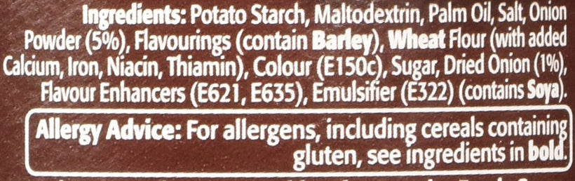 Bisto Onion Gravy Granules 170gIngredients Potato Starch, Maltodextrin, Palm Oil, Salt, Onion Powder (5%), Flavourings (contain Barley), Wheat Flour (with added Calcium, Iron, Niacin, Thiamin), Colour (E150c), Sugar, Dried Onion (1%), Flavour Enhancers (E621, E635), Emulsifier (E322) (contains Soya)