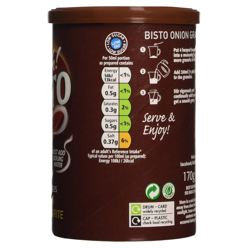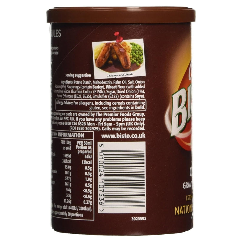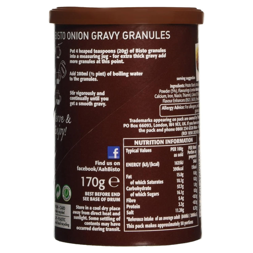 Bisto Onion Gravy Granules 170gIngredients Potato Starch, Maltodextrin, Palm Oil, Salt, Onion Powder (5%), Flavourings (contain Barley), Wheat Flour (with added Calcium, Iron, N...