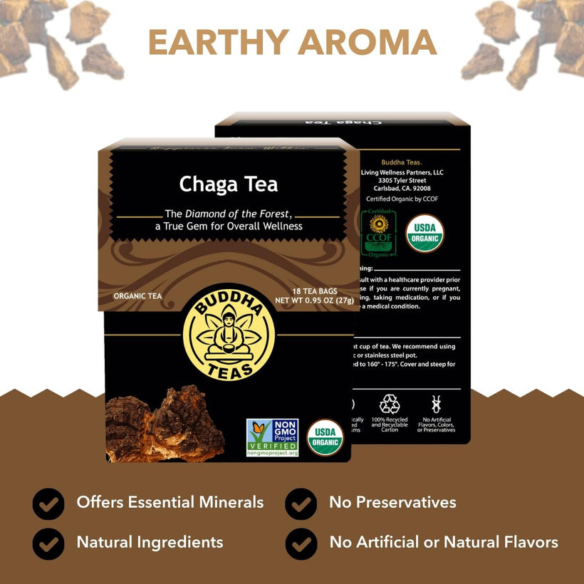 - EARTHY AROMA - Buddha Teas Chaga Tea is medium bodied with a pleasant, earthy flavor. It has surprisingly little mushroom flavor as it possesses a mellow, plant-like taste.