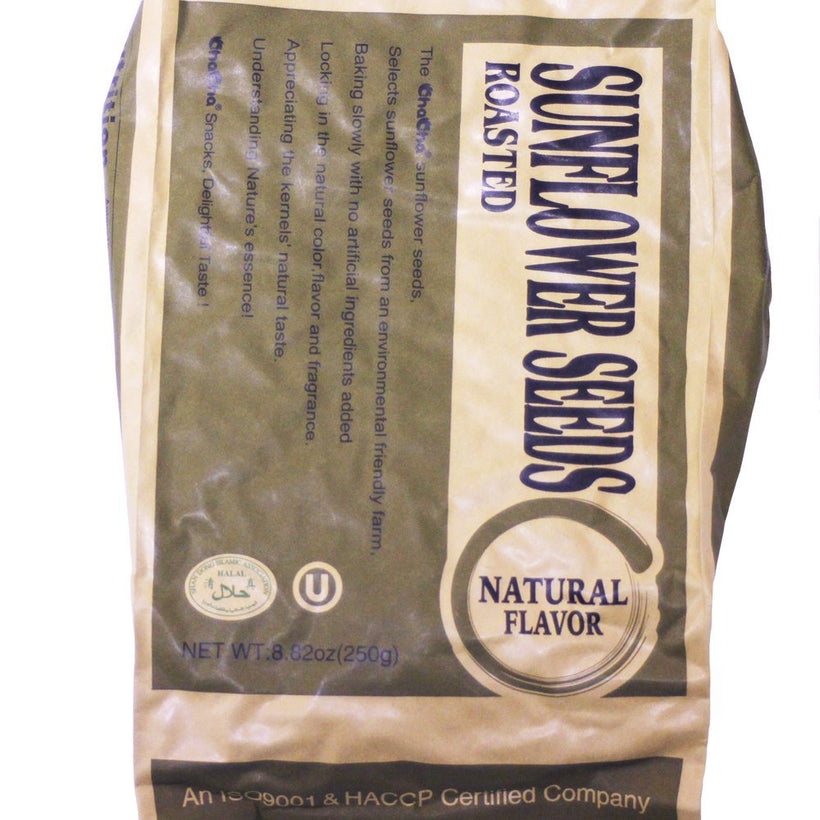ChaCha Sunflower Seeds, Roasted & Salted with Original Flavor 250g x 6 bags. The Chacha sunflower seeds, picking the selected large and plump full sunflower seeds from the natural inner Mongolian environmental-friendlystuffed , after steaming and roasting, the crispy tasty seeds for sure bring you the happiness of delicious feeling. The Cha Cha Snacks, Delightful Taste! Product of China. ISO 9001 Certified, Halal Certified, OU Kosher Certified