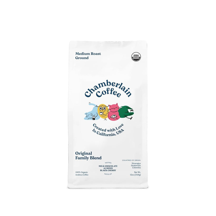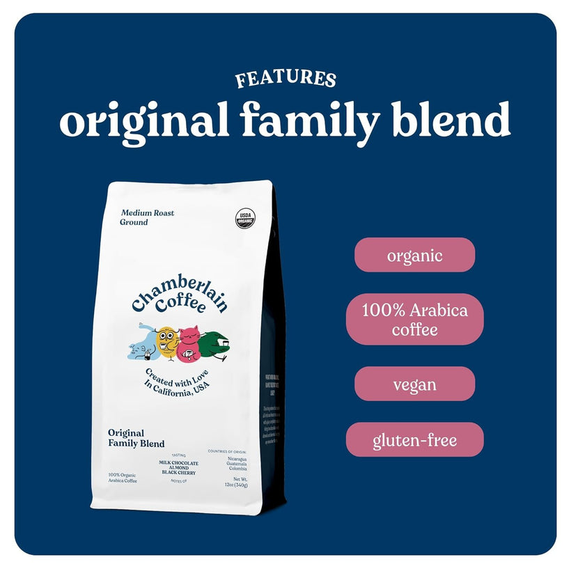 • Chamberlain Coffee The Original Family Blend - Medium Roast Ground Coffee Beans with Notes of Milk Chocolate, Almond & Black Cherry - Specialty Ground Coffee Freshly Roasted In California - 12 oz