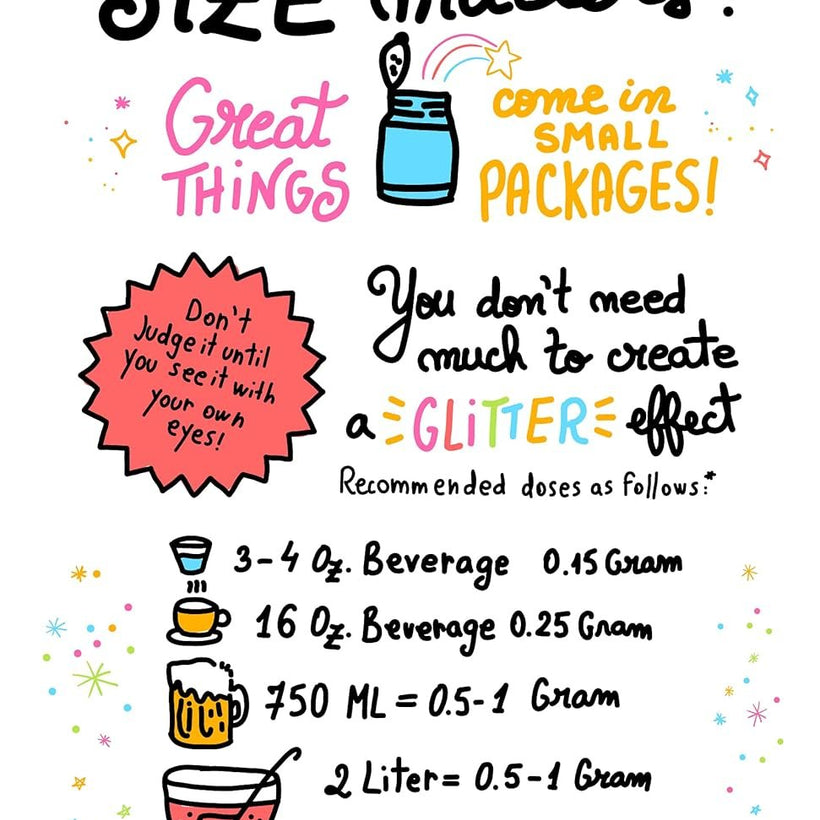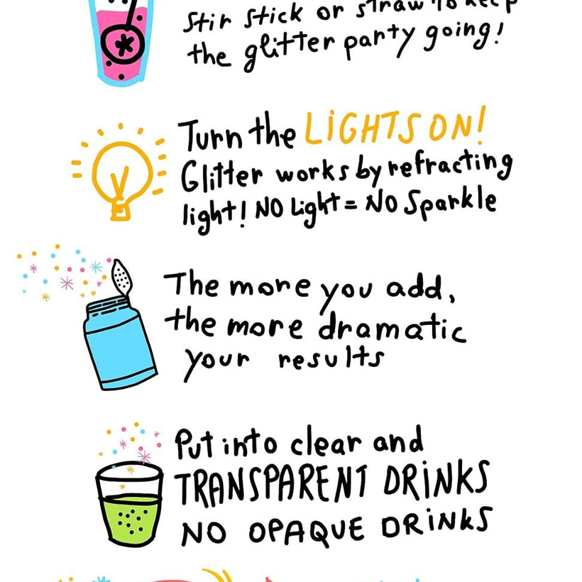 • Shake into your cocktails, coffee, wine, beer, sparkling water, teas and more for a shimmery, sparkly, glittering effect that will magically appear when added to beverages!