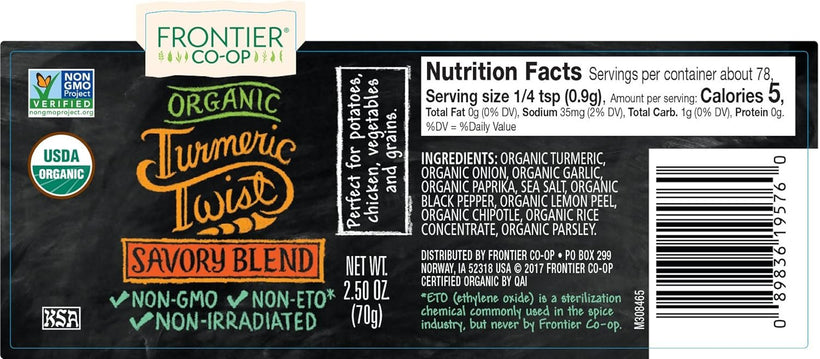 Frontier Organic Turmeric Twist | Savory Blend | Certified Organic | 2.5 oz. A robust blend of organic turmeric, onion, garlic, paprika and black pepper Certified Organic, Non...