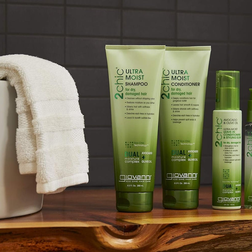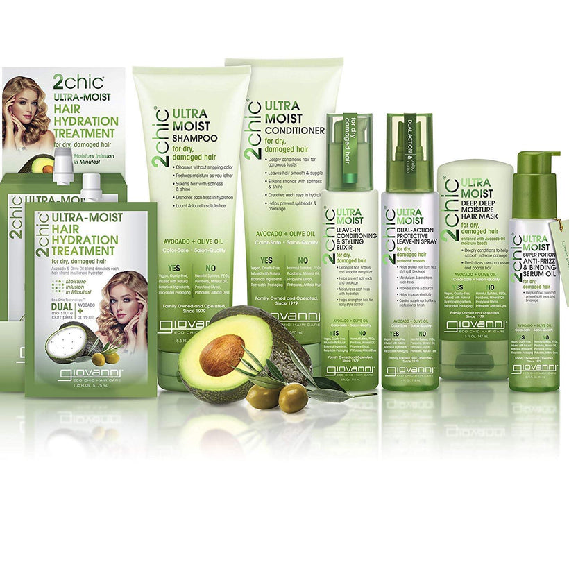 GIOVANNI 2Chic Ultra-Moist Leave In Conditioner contains a dual moisture complex of Avocado and Olive Oil to help treat dry, damaged hair. This ultra moisturizing conditioner si...