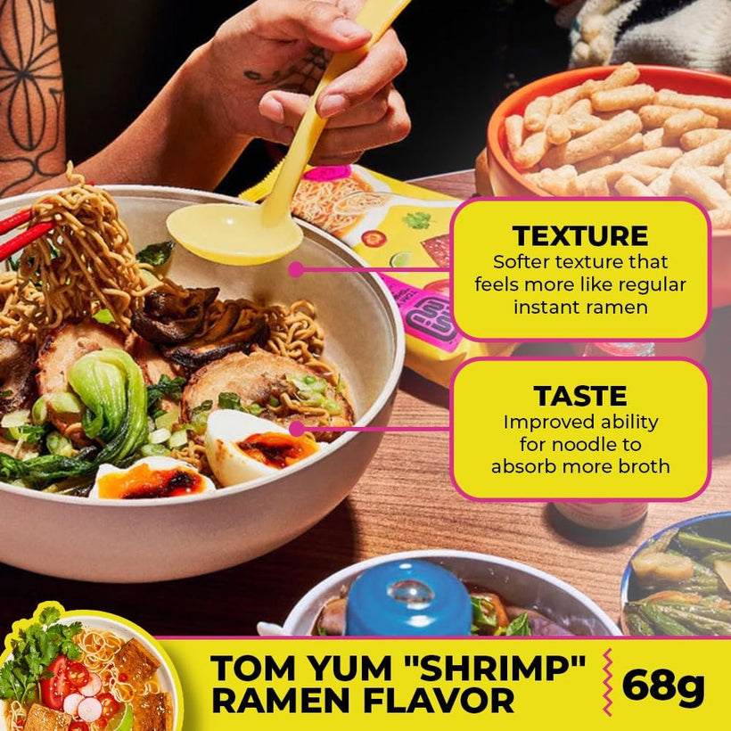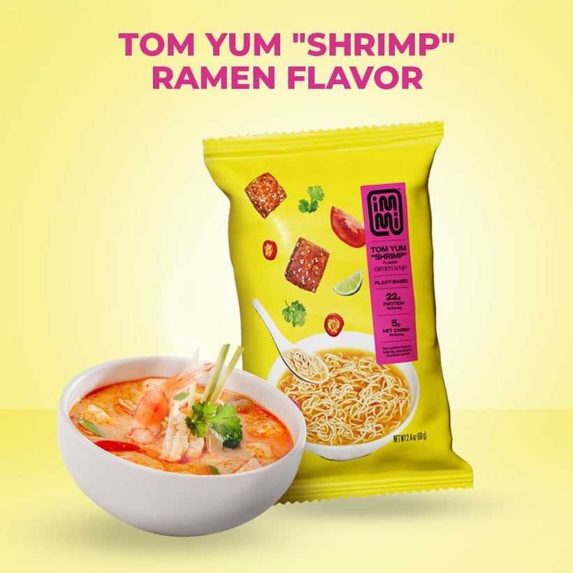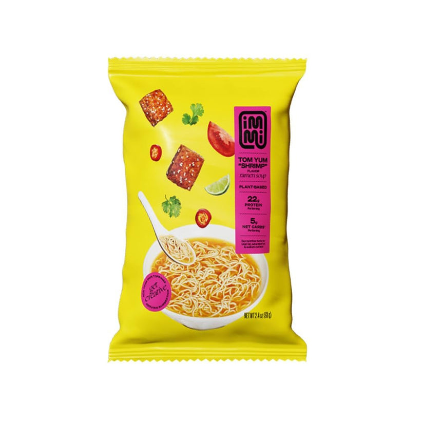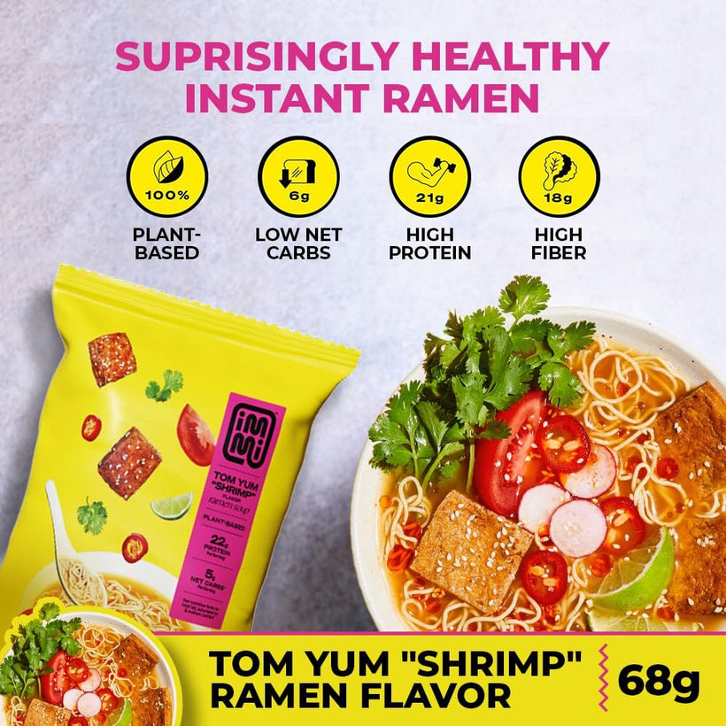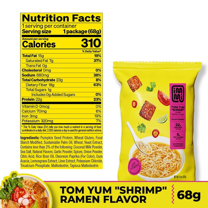 - Healthy alternative to traditional instant ramen noodle soup! Our bulk bundle includes three 2.4 oz bags of Immi Ramen Soup in Tom Yum Shrimp flavor. With 22g of protein, only 5g of net carbs, and 100% plant-based ingredients, this instant ramen is the perfect low-carb and high-protein option for those who want to stay healthy while enjoying a delicious meal.