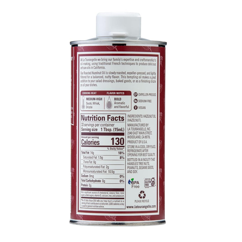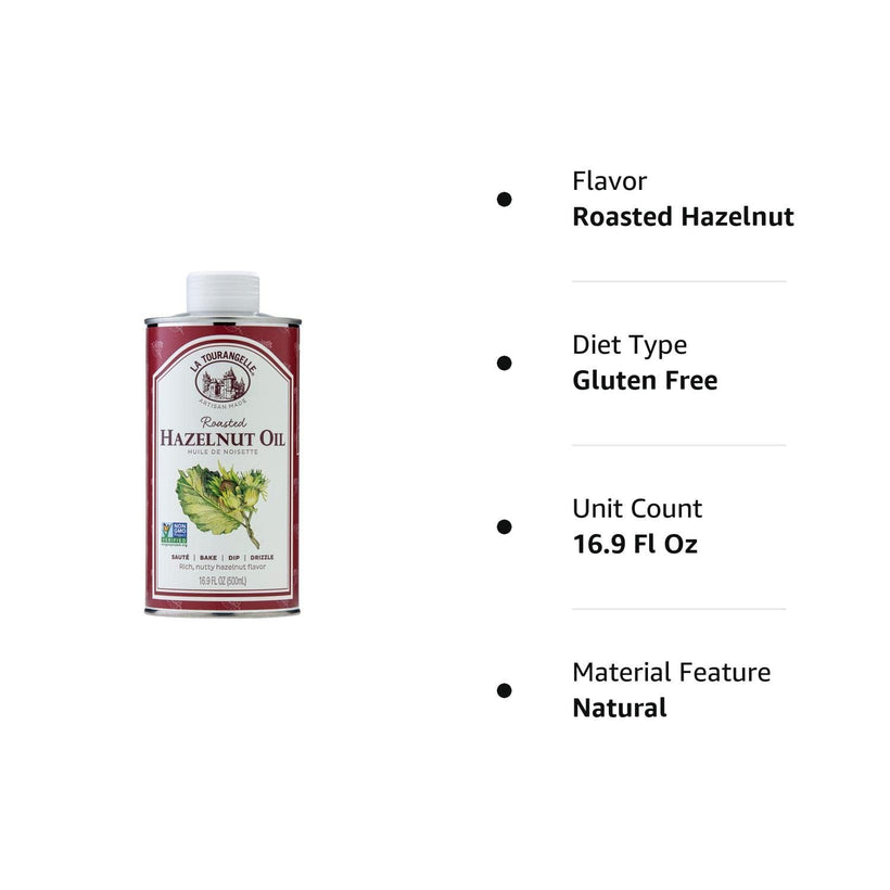 • Nutty and Fill Bodied: Great in salads, full-bodied La Tourangelle Roasted Hazelnut Oil provides balanced, nutty notes to any dish. Bake into pastries for a nutty flavor, or drizzle in your coffee for a fresh flavor