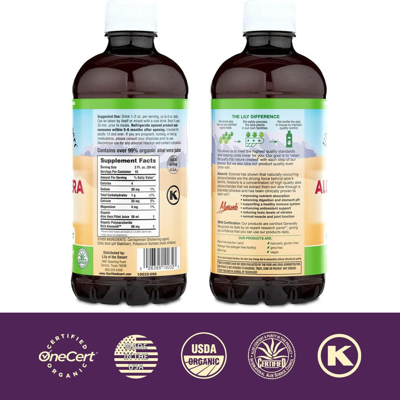 - BIO-ACTIVE ALOE JUICE: Aloe vera, organically grown on Lily of the Desert’s own fields, yields a bio-active juice with a multitude of benefits for your whole body, including your digestive system.