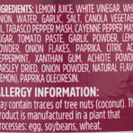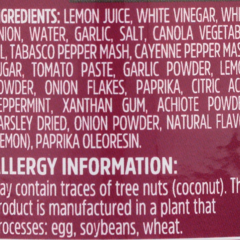 • Ingredients: lemon juice, white vinegar, white onion, water, garlic, salt, canola vegetable oil, tabasco pepper mash, cayenne pepper mash, sugar, tomato paste, garlic powder, lemon powder, onion flakes, paprika, citric acid, peppermint, xanthan gum, achiote powder, parsley dried, onion powder, natural flavor (lemon), paprika oleoresin.