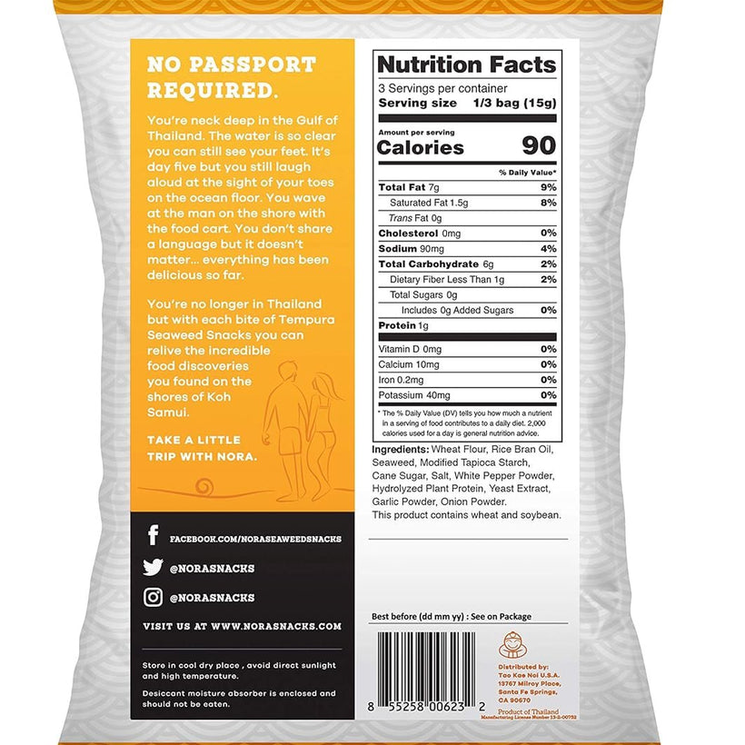 - SEAWEED SNACK Thai-flavored and mouth-watering, Nora Tempura Seaweed will let you relive the incredible food discoveries you found on the shores of Thailand. Crispy and crunchy like a potato chip, yet vegan and low-sugar,