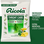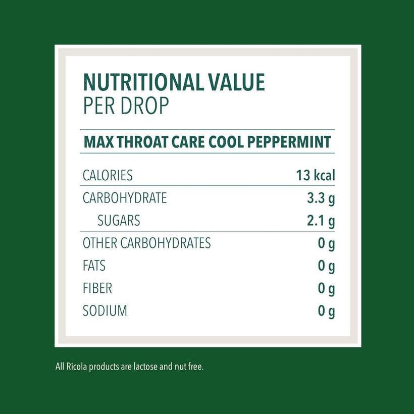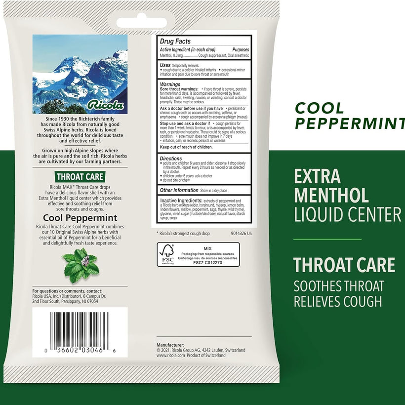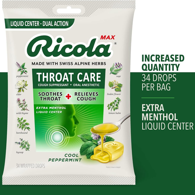 - RICOLA MAX* THROAT CARE COOL PEPPERMINT cough drops combine the world-famous Ricola original 10 Swiss Alpine herbs with the freshness of menthol for a long-lasting, refreshing taste experience that helps soothe coughs and sore throats. Ricola Max Throat Care cough drops have a delicious flavor shell with an Extra Menthol liquid center which provides effective and soothing from sore throats and coughs. [* Ricola's strongest cough drop]