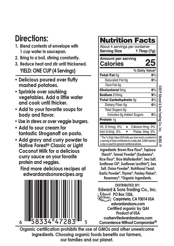 INGREDIENTS: Organic Brown Rice Flour, Organic Tapioca Starch, Organic Tamari Powder (Organic Soybeans, Organic Rice Flour, Organic Rice Maltodextrin, Sea Salt, Organic Sunflower Oil, Lecithin), Sea Salt, Organic Onion Powder, Nutritional Yeast, Organic Garlic Powder, Organic Thyme, Organic Parsley Flakes, Organic Rosemary.