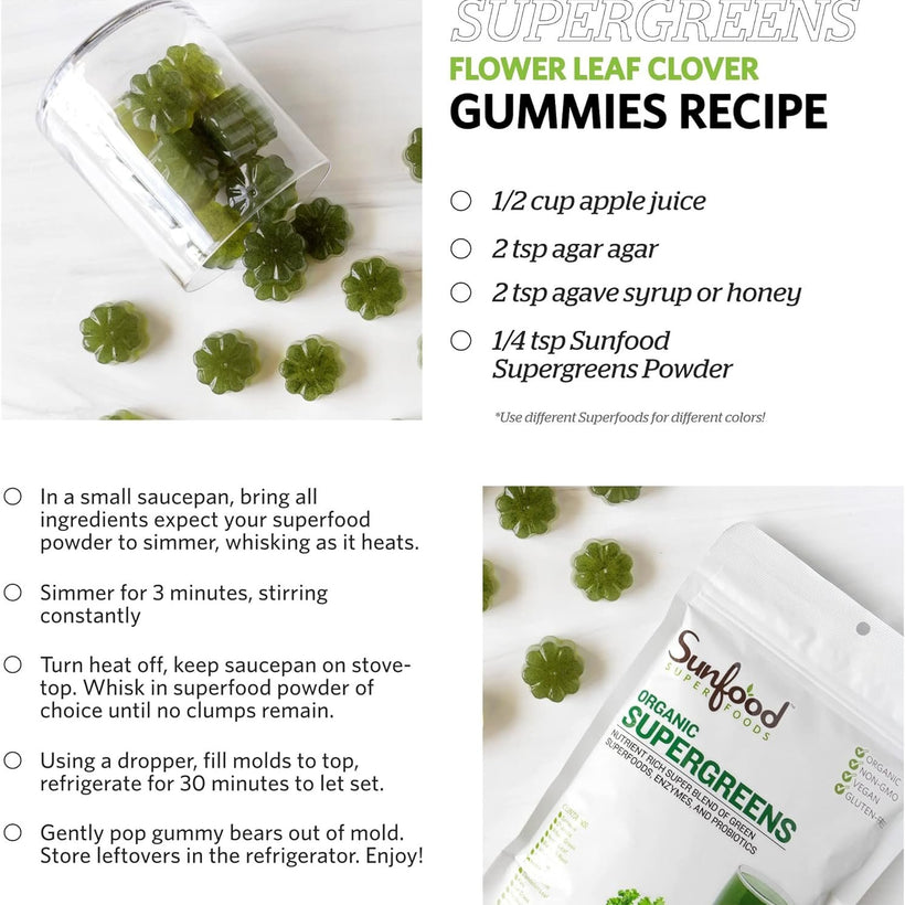- SUGGESTED USE: Mix 2 teaspoons of Supergreens into your favorite smoothies, vegetable and fruit juices, or with water daily and enjoy. Use the green powder to make a healthy alternative to your morning coffee, or to make an energy boosting pre workout drink. You can also sprinkle it over your meals to get your daily greens in!