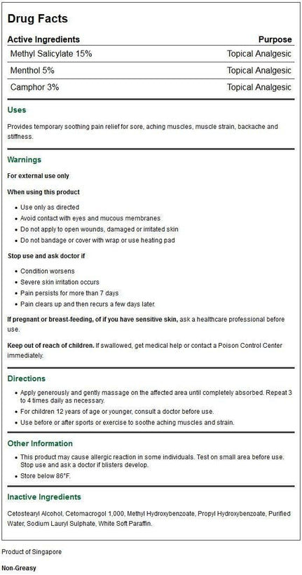 Soothe out muscle and joint discomfort with Tiger Balm Active Muscle Rub. This analgesic cream formula is non-greasy and easy to apply at home or in the gym. It contains topical analgesics that provide warm, comforting relief for sprains and strains, backaches, arthritis, and more.