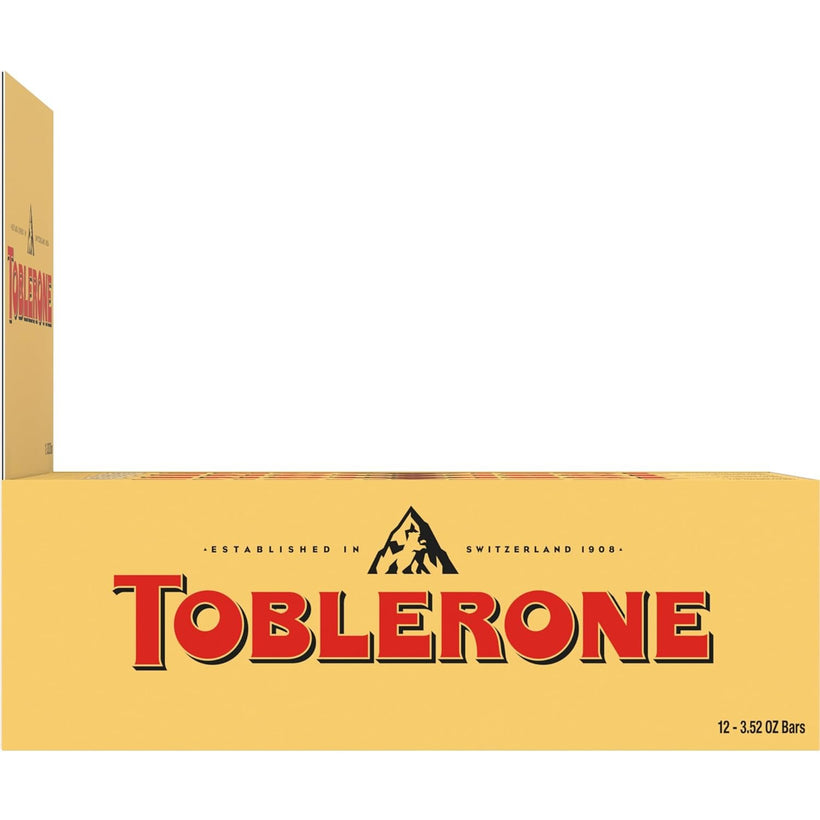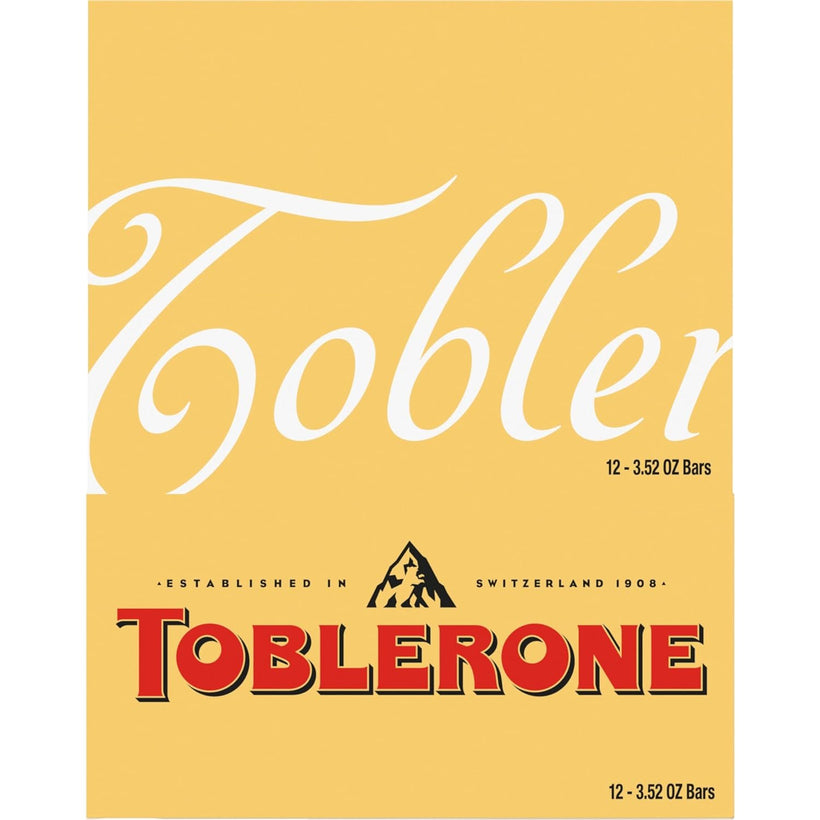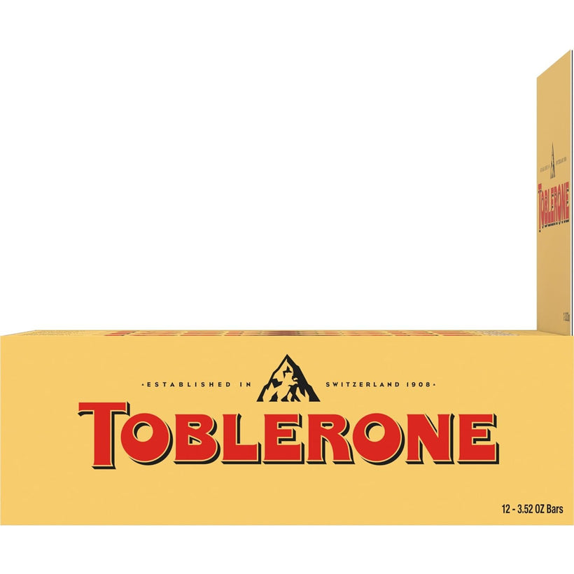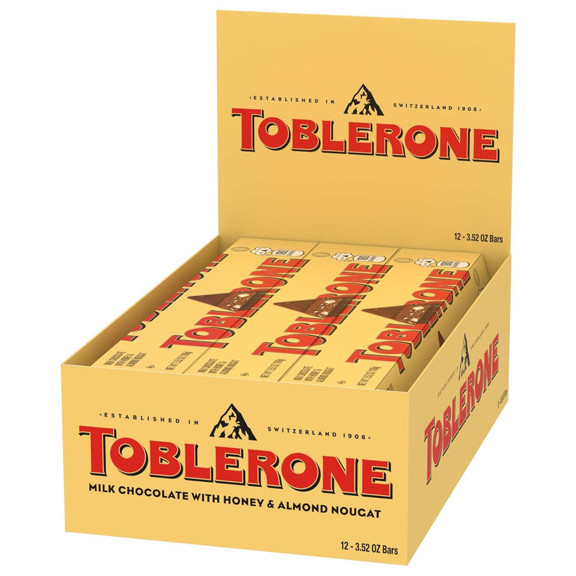 • Twelve 3.52 oz Toblerone Milk Chocolate Bars with Honey and Almond Nougat (packaging may vary)